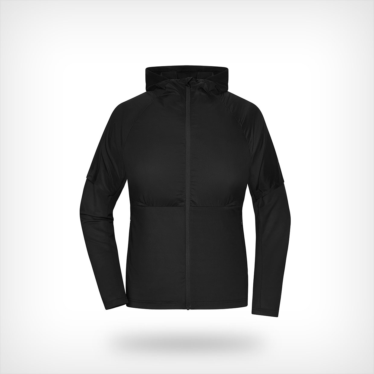 Stijlvol hybride hardloopjack voor hardlopen, sport en fitness. Het jack heeft een aansluitende pasvorm, een ritssluiting met kinbescherming, zijzakken met rits en een aansluitende capuchon.